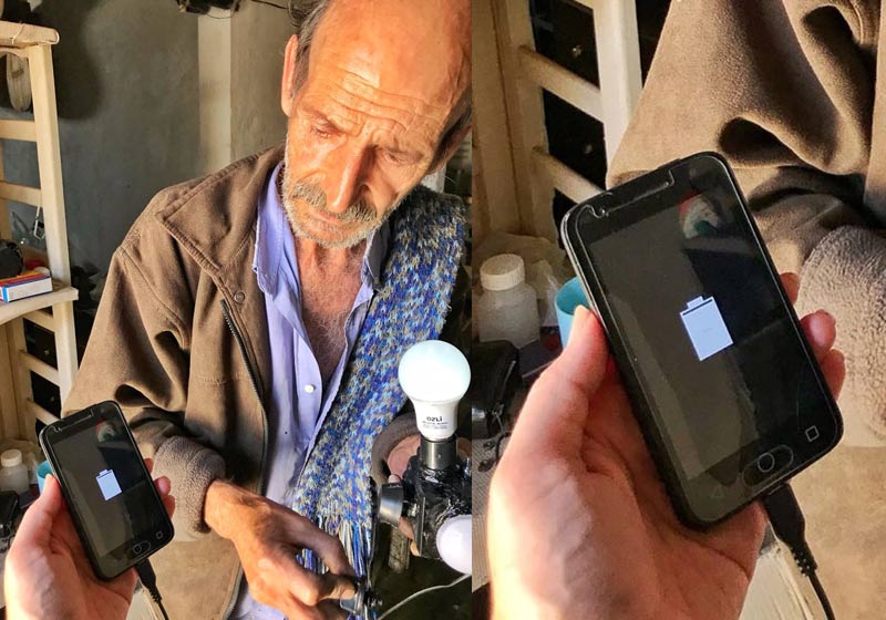 Celso gira uma manivela e, em questão de segundos, aparece o sinal de bateria sendo carregada.