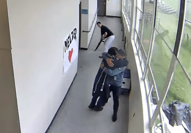 Depois de entregar a espingarda para outro professor, Lowe agarra o aluno com um abraço.