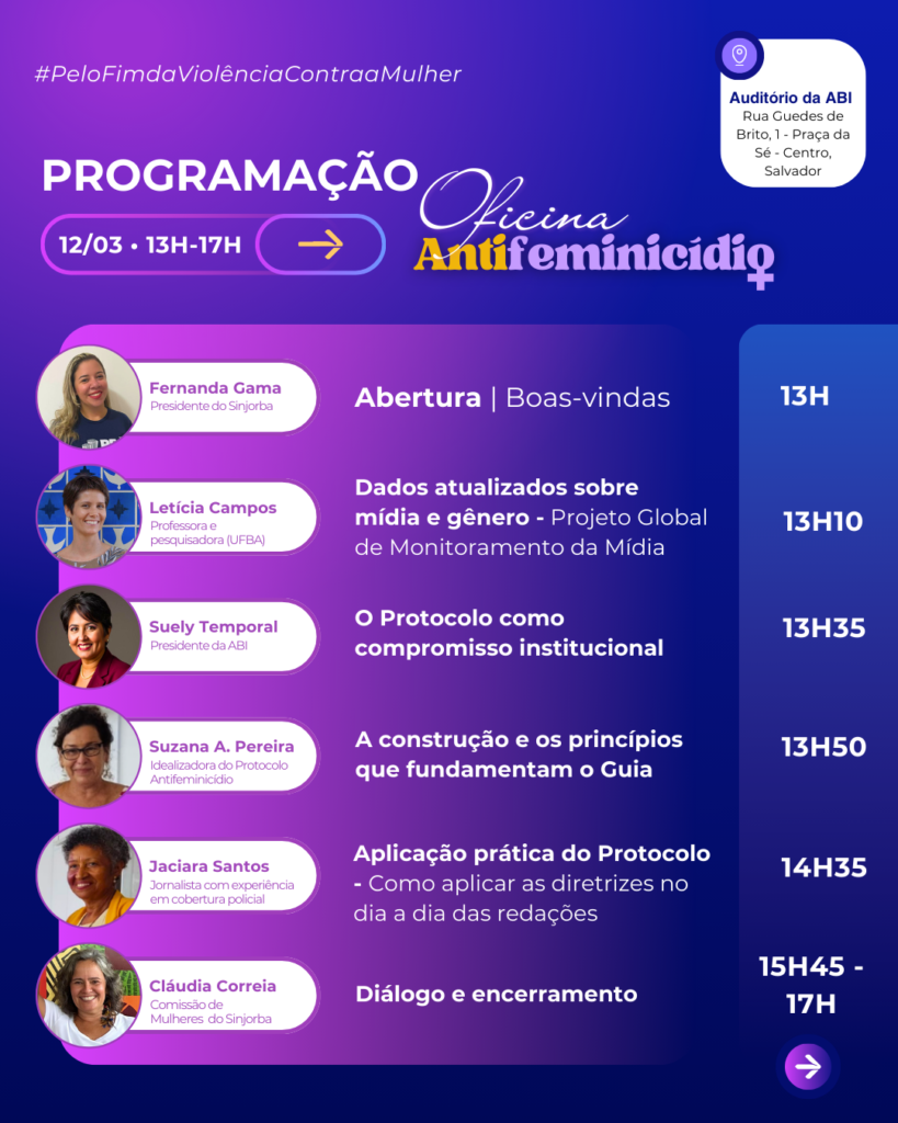 A Associação Bahiana de Imprensa (ABI) e o Sindicato dos Jornalistas Profissionais da Bahia (Sinjorba) realizam, no dia 12 de março, a oficina “Protocolo Antifeminicídio – Guia de Boas Práticas para a Cobertura Jornalística”, voltada à qualificação da cobertura da violência de gênero na imprensa.