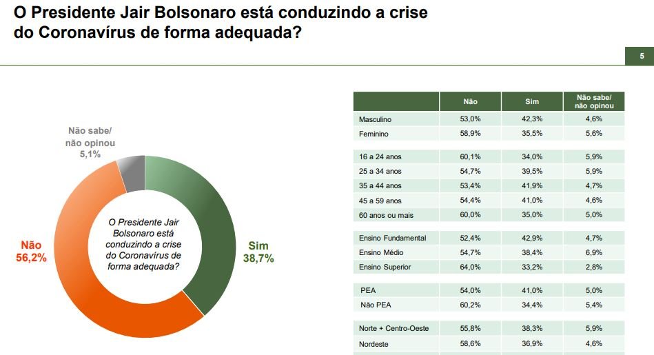 O levantamento mostrou que 38,7% dos entrevistados acreditam que o presidente conduz bem a crise enquanto 5,1% das pessoas não sabem ou não opinaram sobre a questão. Com grau de confiança de 95%, a pesquisa tem margem de erro de 2%.