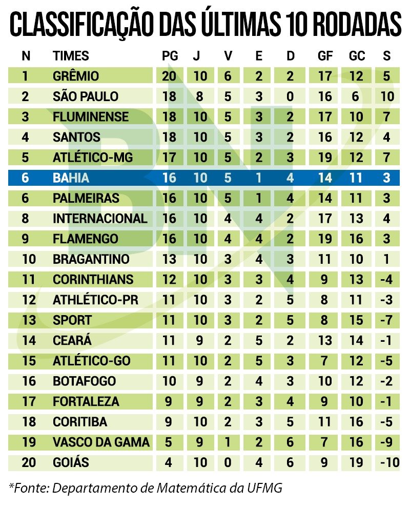 Com o objetivo de seguir no pelotão de cima, o Esquadrão de Aço volta a jogar pela competição na próxima sexta-feira (20) contra o Red Bull Bragantino, no estádio Nabi Abi Chedid, pela rodada 22. Confira a tabela de classificação nas última dez rodadas do Brasileirão: Arte: Paulo Victor Nadal / Bahia Notícias